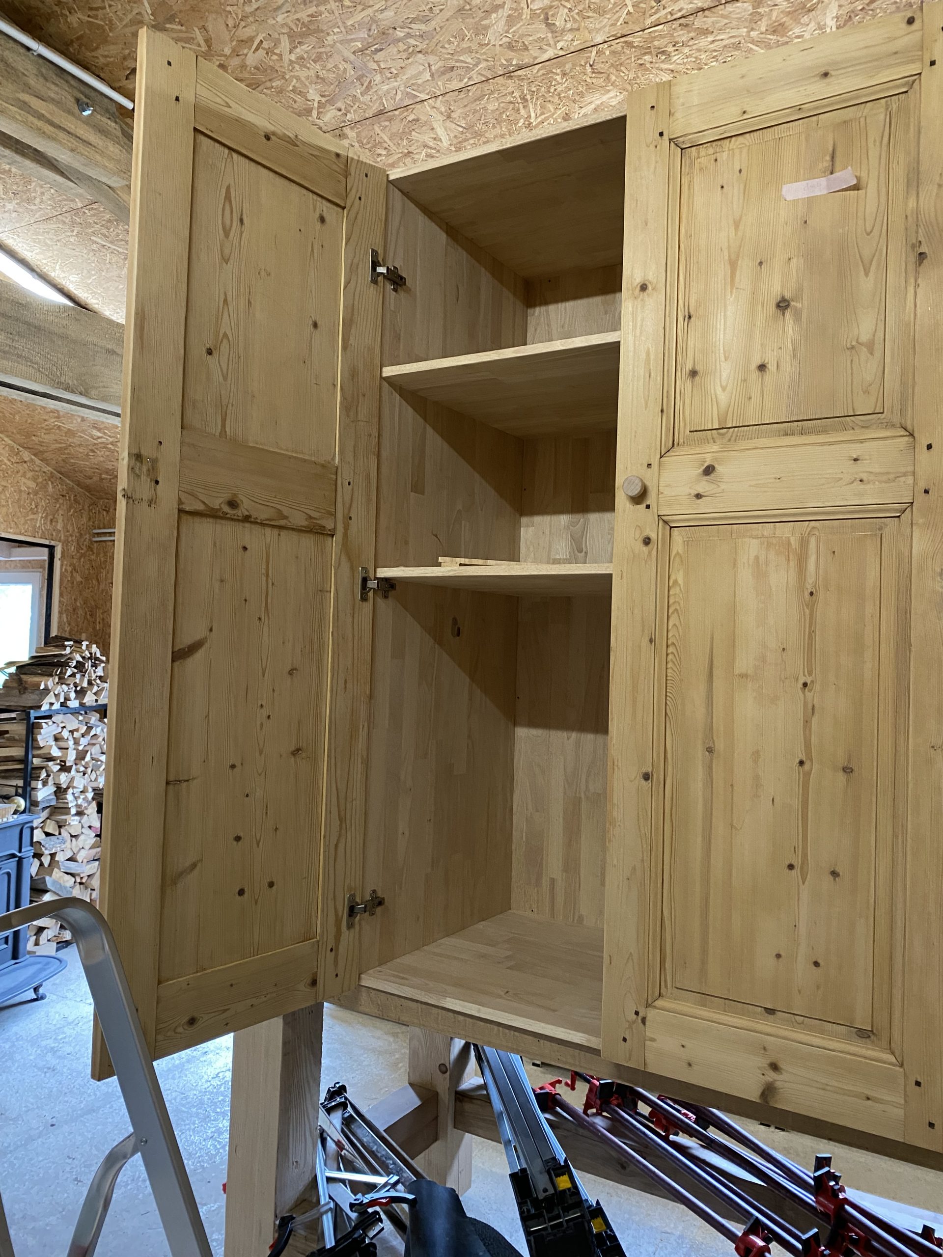 Réutilisation d’anciennes portes pour une armoire pleine de caractère.